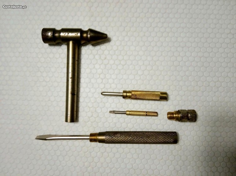 Raro martelo de viagem, com cerca de 20 cms. Anos 50 com vários utensílios. Peça muito curiosa, pois na época era pouco conhecida. Em metal.