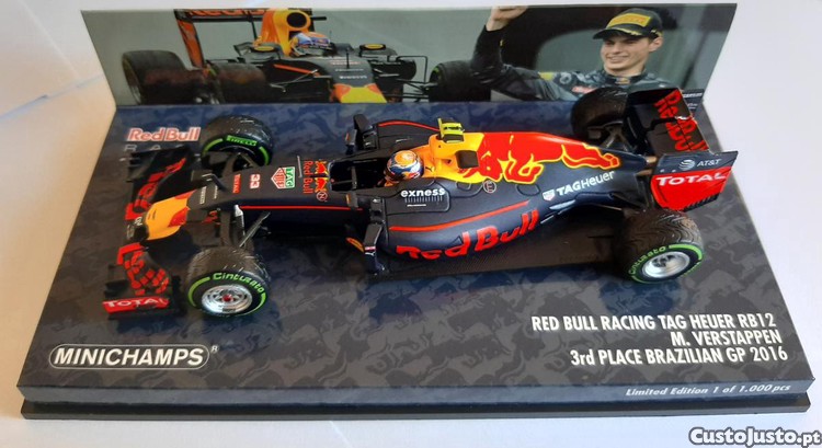 Miniatura de Fórmula 1 da marca Minichamps, na escala 1:43, do Red Bull RB12, 3 no GP Brasil de 2016. Piloto Max Verstappen. Em muito bom estado.