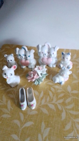 Miniaturas em porcelana de coelhos, 2 com par e mais 4 soltas, um bouquê de rosas e um par de sapatos.