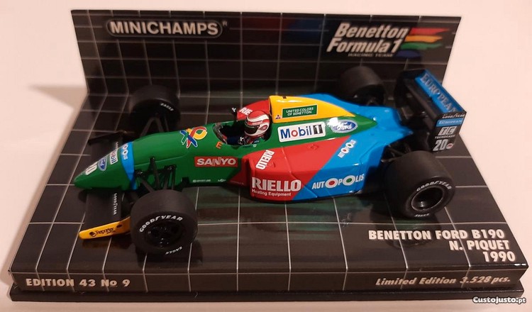 Miniatura de Fórmula 1 da marca Minichamps, na escala 1:43, do Benetton B190 de 1990, do piloto tricampeão do mundo Nelson Piquet. Em muito bom estado.