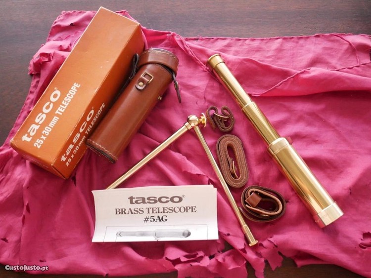 N 22281 Mira telescópica Brass Telescop #5AG Tasco 25x30mm. 35,5cm de comprimento. Em estojo de couro de origem, e caixa com instruções. Latão polido Made in Japan.