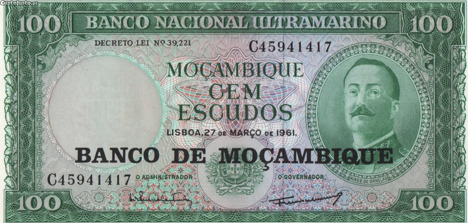 Uma das primeiras notas de Moçambique pós-independência, com sobrecarga "Banco de Moçambique" sobre a nota de 100 Escudos de 27/3/1961 do tempo colonial.