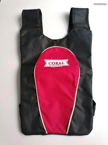Mochila pequena com publicidade à cerveja Coral da Madeira.