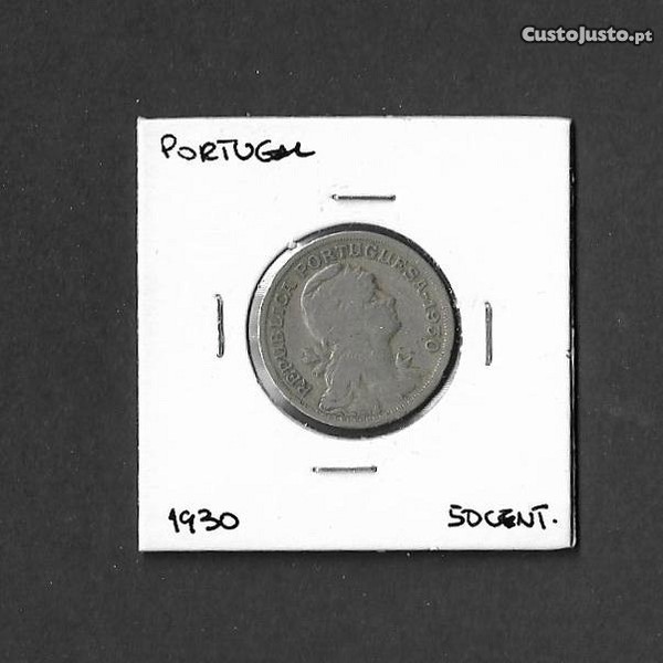 Moeda circulada 50 centavos. Portugal 1930. Alpaca, peso 4gr. diam. 23mm e espessura 1,3mm.