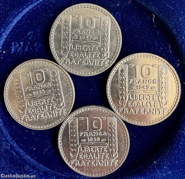 Lote de 4 moedas francesa de 10 francos de 1949, com a inscrição "Liberté, Égalité, Fraternité" (Liberdade, Igualdade, Fraternidade), o lema da República Francesa.