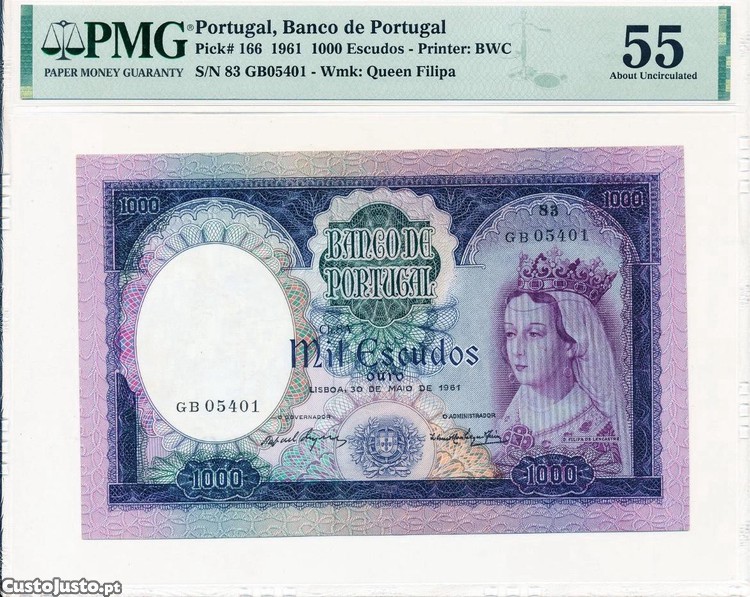 Preço: 300 €Nota 1000 escudos Filipa de Lencastre certificada PMG