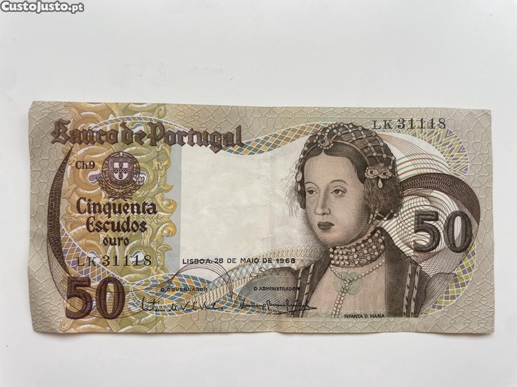 Nota antiga de 50 Escudos portugueses, emitida em 1968 pelo Banco de Portugal, com a figura de D. Catarina de Bragança.