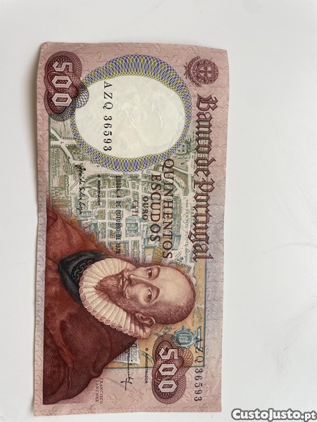 Nota antiga de 500 Escudos portugueses, emitida em 1987 pelo Banco de Portugal, com a figura de Pedro Álvares Cabral.