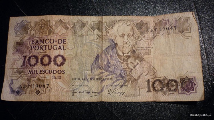 Preço: 5 €Nota de 1.000$00,Teófilo Braga,1987