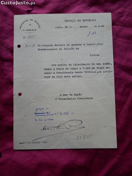 N 21865 Ofício da Presidência da Relação de Lisboa a substituir a Presidência deste Tribunal por motivo de falecimento de um irmão do Presidente.