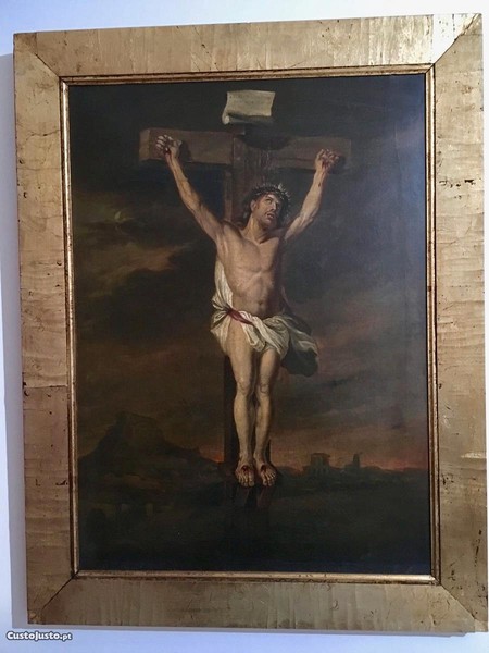Óleo sobre tela, motivo religioso, finais séc. XVIII, com moldura em madeira maciça dourada