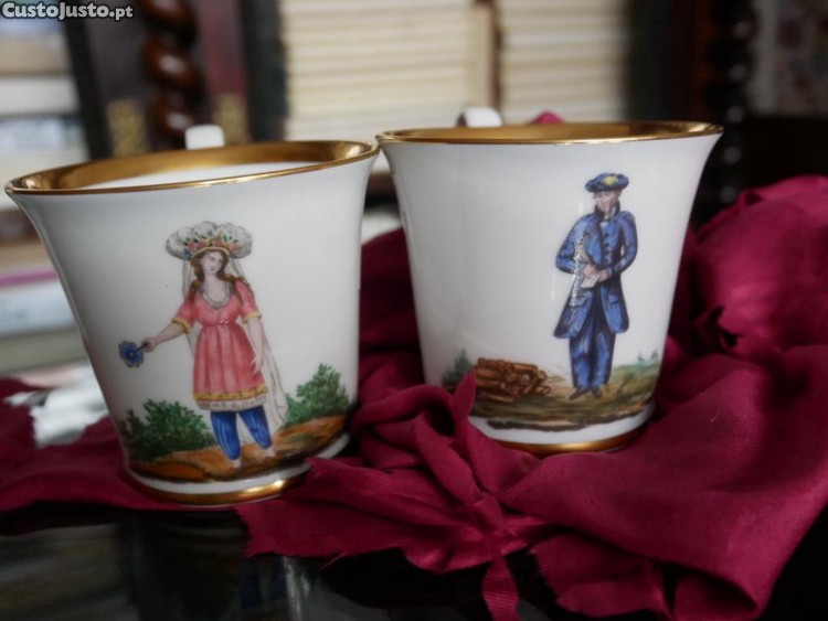 N 24674 Par de canecas da Vista Alegre, decoração policromada e dourada, figura feminina e masculina, marca nº 36 1980-1992. Numerada 936/2500. Canecas exclusivas do ano 1989 do Clube dos Colecionadores Vista Alegre