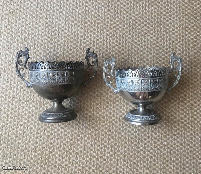 Preço: 35 €Par de taças trabalhadas com pegas laterais em casquinha de prata