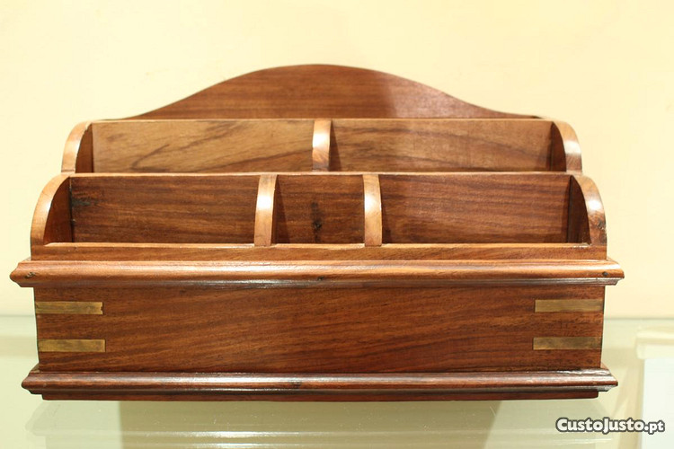 Suporte antigo para cartas e papeis de secretária, madeira maciça com aplicações em metal