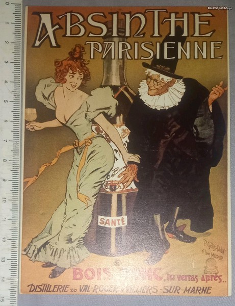 Este postal é uma reprodução de um antigo poster publicitário de 1894 para *ABSINTHE PARISIENNE* da destilaria "Val Roger", ilustrado por Roger Gelis Didot e Malateste. Retrata uma jovem com um longo vestido verde (a bebida era chamada também de Fada Verde por escritores e pintores) oliva claro e muito decotado, segura na mão direita um copo cheio da bebida e ao seu lado está um mago ancião, vestido de preto com colarinho branco. Os dois estão em frente a uma grande garrafa da bebida. Abaixo delas, há a frase, slogan: "Então beba que depois você verá..."