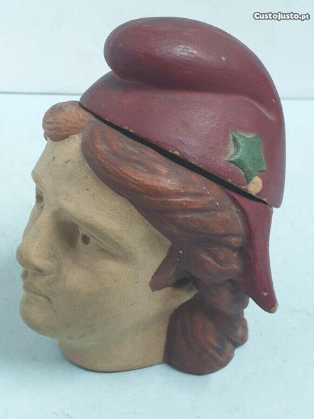 Raro pote para tabaco em faiança, provável fabrico (Caldas?) embora não assinado representando a cabeça da Republica Portuguesa.