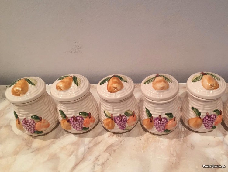 Vendo 5 potes de especiarias em loiça branca e pintados à mão.