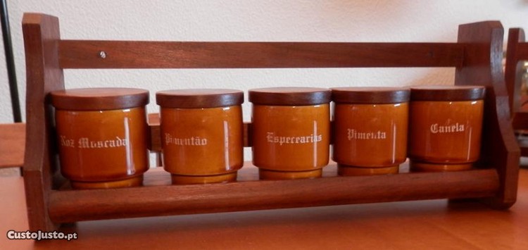 suportes em madeira com potes em faiança SECLA, para especiarias. Em perfeito estado.