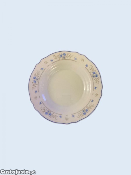 Adornado com uma fina linha azul no rebordo.