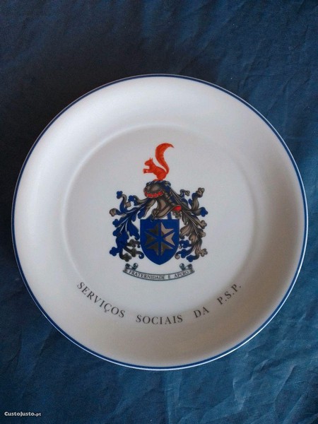 Prato decorativo de cerâmica dos anos 80, com o brasão dos Serviços Sociais da P.S.P..Trata-se um prato comemorativo e está em muito bom estado. Mede 20 cm de diâmetro. Raro, foram feitos em número limitado. Barato para desocupar. Negociável, vendo pela melhor