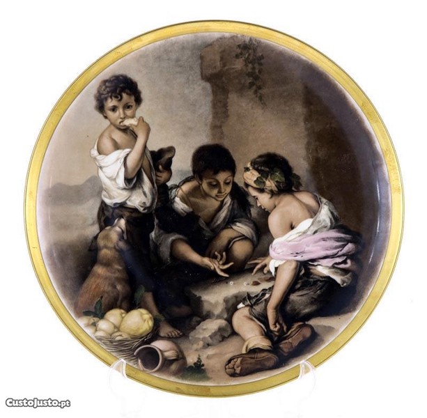 PRATO DECORATIVO EM PORCELANA - Decoração policromada com bordo a dourado, representando pintura clássica com 3 crianças a jogar dados e cão. Marcado na base "Baviera - Gloria - Bayreuth", com fileta a DullGold de 22 carat. Dim: 32 cm de diâmetro.