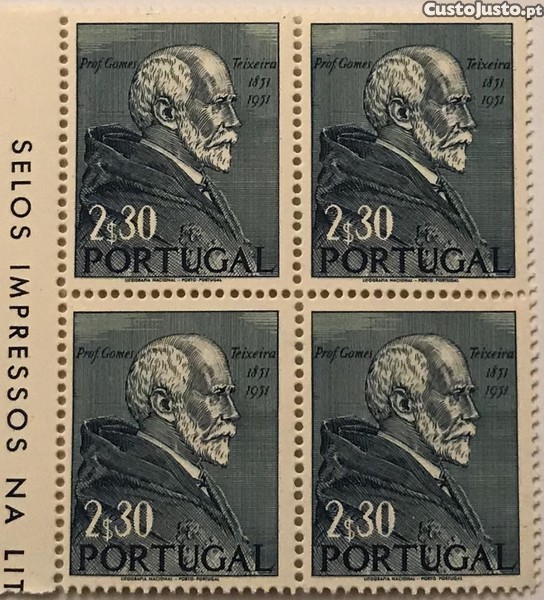 Quadra de selos novos de 2$30 - 1. Cent. do nascimento do Professor Doutor Gomes Teixeira - 1952