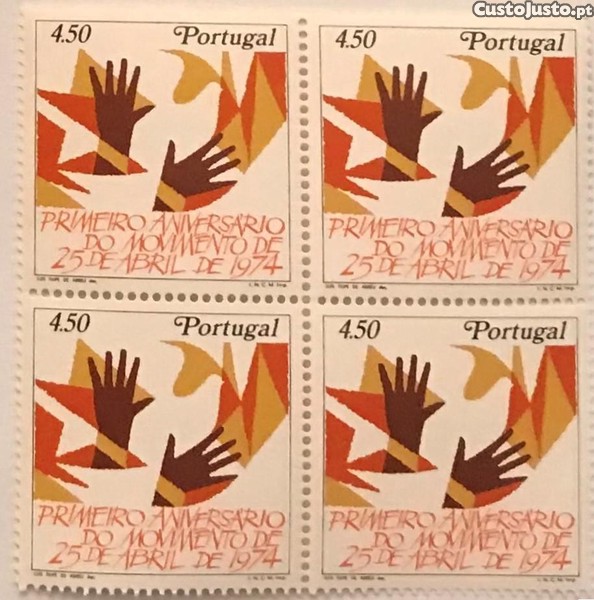Preço: 10 €Quadra de selos novos de 4$50 - 1. aniversário do Movimento de 25 de Abril - 1975