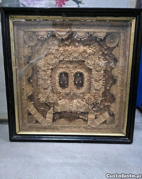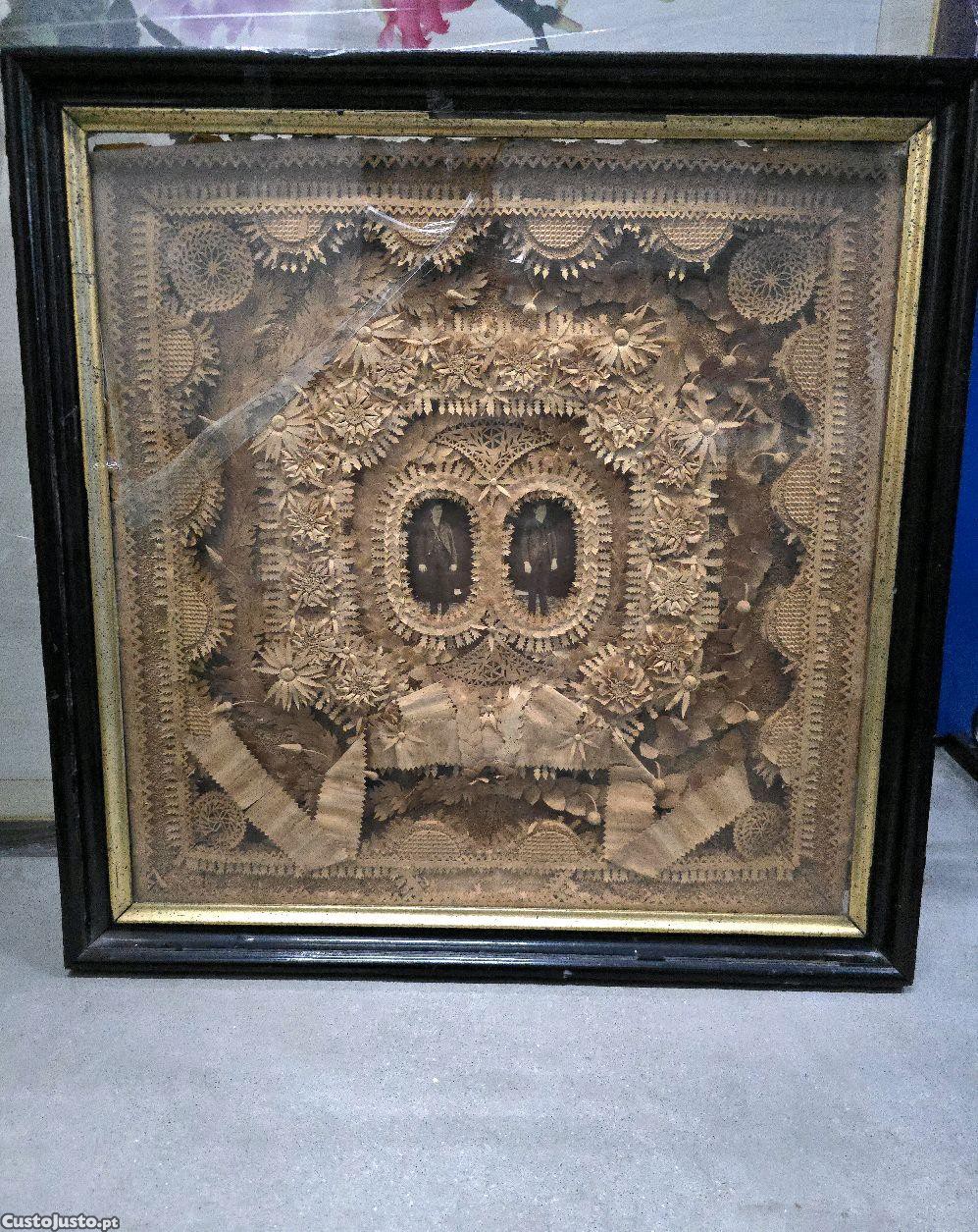 Peça rara de arte popular portuguesa, composta por cortiça finamente recortada e trabalhada em motivos florais e geométricos, formando uma composição rendilhada em relevo. No centro apresenta duas fotografias antigas enquadradas pelo trabalho decorativo.
