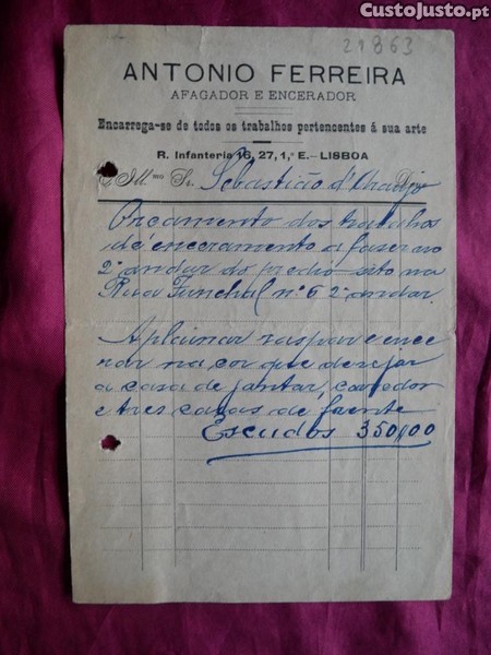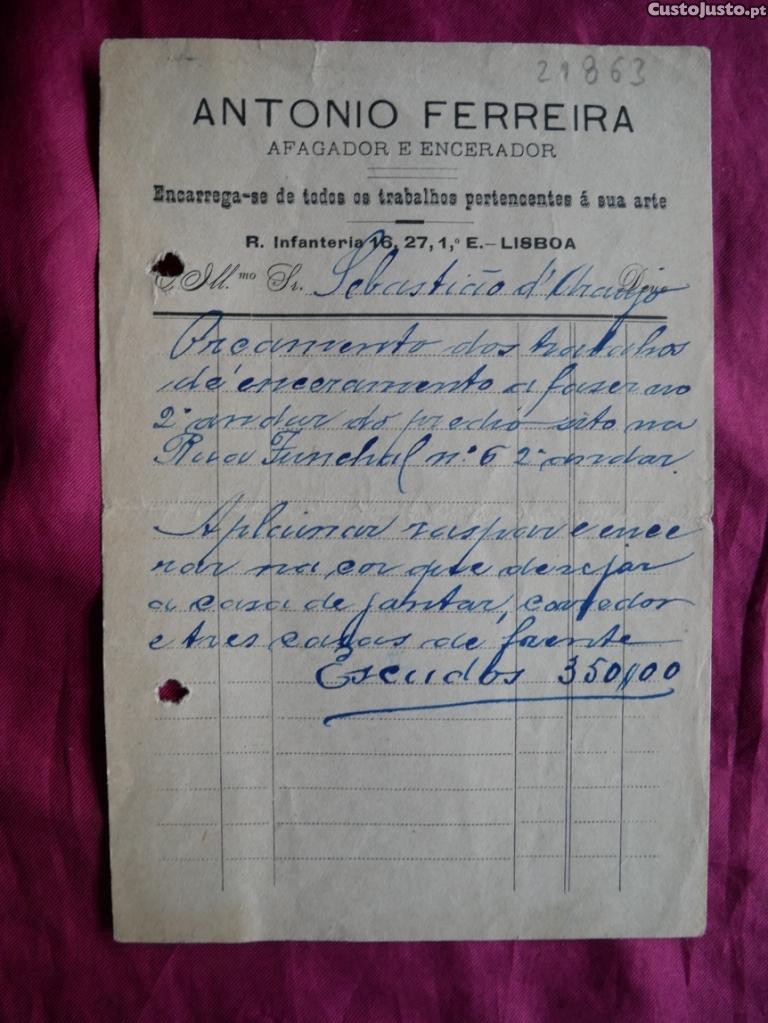 N 21863 Recibo de António Ferreiro, Afagador-Encerador. 1927-1928