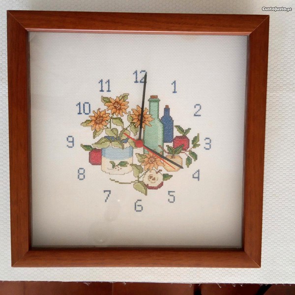 Este relógio foi bordado por uma familiar e posteriormente foi emoldurado cx com vidro. Necessita de mecanismo vulgar de pilha, razão deste preço. Está impecável. cerca de 30 x30 cms