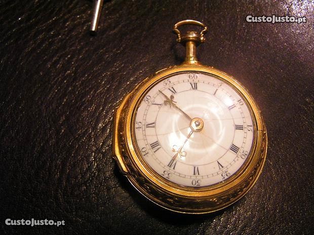 Relógio de bolso muito antigo, verdadeira preciosidade e raridade, com dupla caixa em ouro, fabricado por In Rich, London 779, toca as horas e também os quartos de hora. A maquinaria precisa ser limpa e afinada