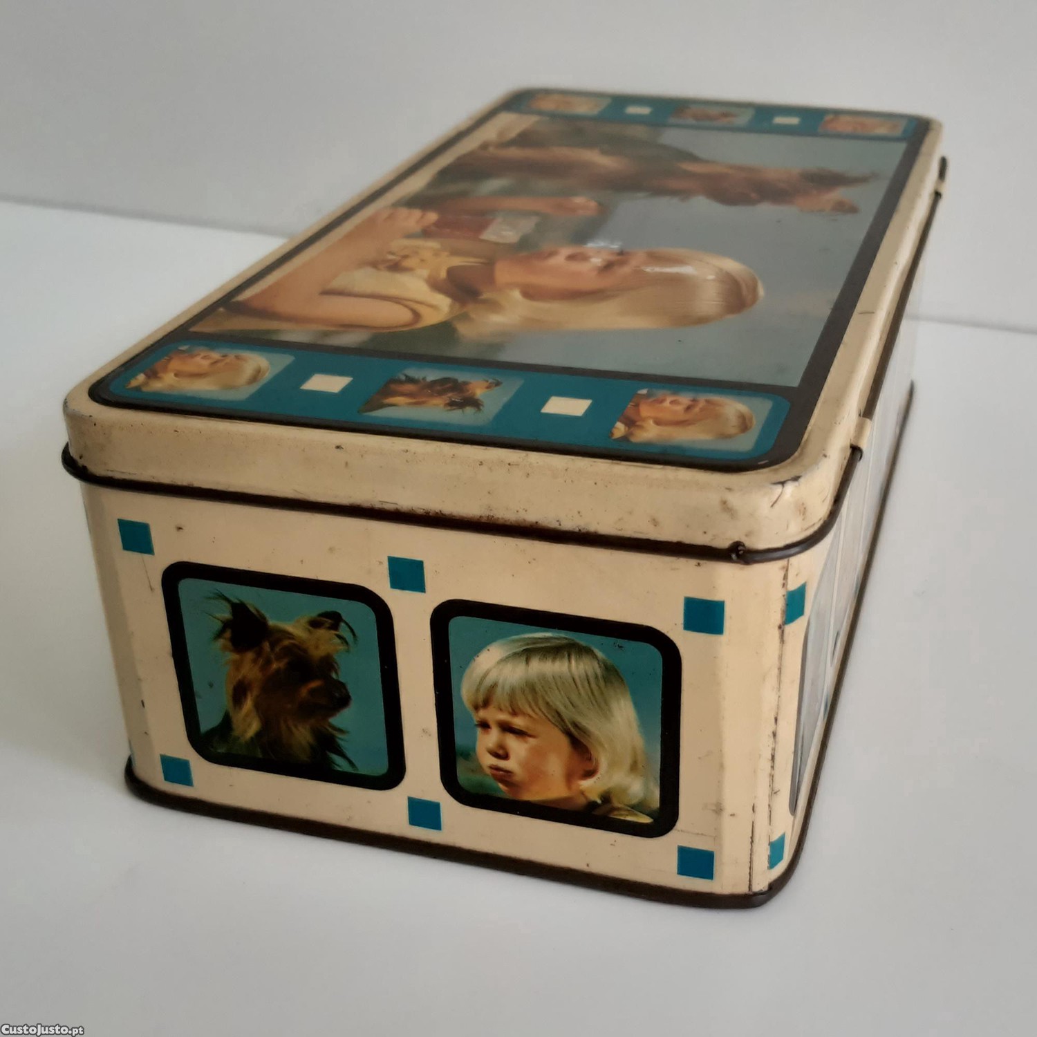 Caixa com tampa vazia lata metal da Sociedade Industrial Villares, antiga produtora do Porto de bolachas, biscoitos, rebuçados, drops e amêndoas.