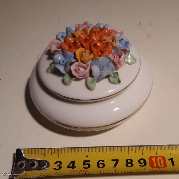 Porcelana branca vidrada no interior e exterior. Flores lindas e coloridas na tampa.