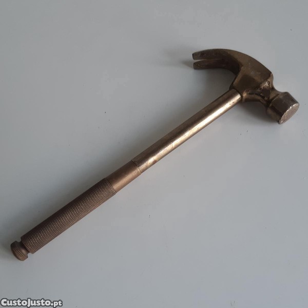 Martelo de orelhas todo em latão com 3 chaves de fendas e uma philips, diversos tamanhos, que enroscam e formam o resto do cabo do martelo. Pontas das chaves em aço.