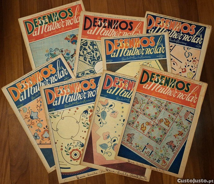 8 revistas antigas sobre rendas, bordados e figurinos título" Desenhos para a mulher no lar" edição litografia Tejo 1 edição nr.132 ao nr.139 dezembro de 1945 a julho 1946. Pagamento/transferência. Portes a cargo do comprador. Entrega em mão na zona de cascais e em Lisboa zona do areeiro.