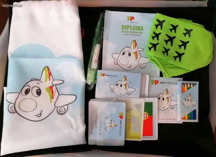 Saco tipo mochila contendo artigos da TAP, composto por os artigos que estão nas fotos.