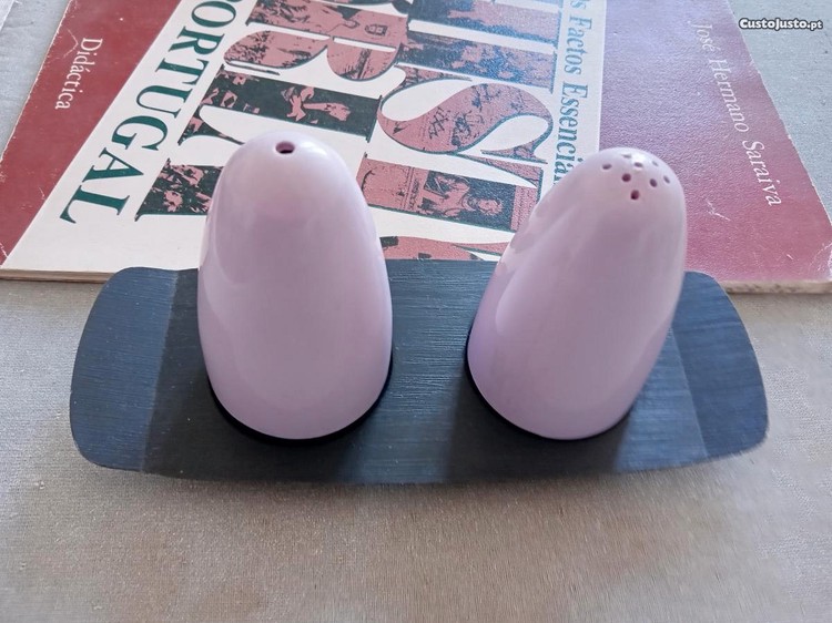 Saleiro e Pimenteiro Vintage cor lilás assente numa base de cor preta.