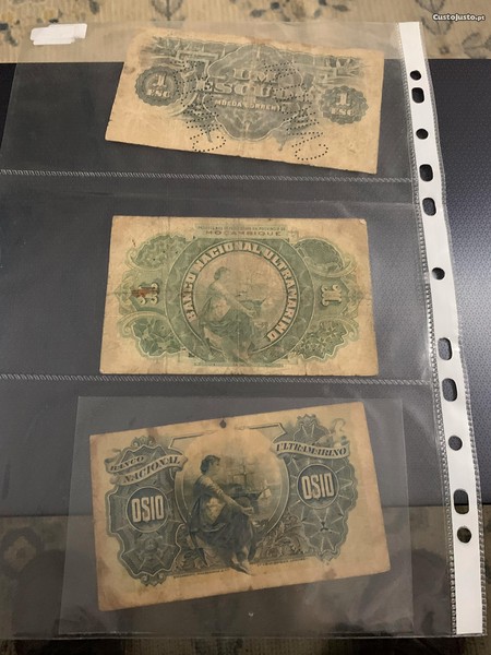 Estas três Notas são preciosidades, pois são das mais invulgares, antigas e valiosas das nossas ex-Colónias de Angola e Moçambique: BANCO DA BEIRA - Pagará à vista ao Portador - 1 ESCUDO PRATA Moeda Corrente N 056, 598 de 5 de Setembro de 1919 (exibindo o seu magnífico picotado) BELA; - Banco Nacional Ultramarino Província de Moçambique Um ESCUDO Pagável nas Dependências da Província de Moçambique N L 211,608 de 1 de Janeiro de 1921 Bc.; - Banco Nacional Ultramarino em Loanda DEZ CENTAVOS Moeda corrente N 0,395,948 de 5 de Novembro de 1914. Bc. Este lote é pois de elevado valor sobretudo pela sua grande raridade. NOTA: o estado de conservação e o valor estimado não são vinculativos, cabendo ao interessado a verificação das mesmas.