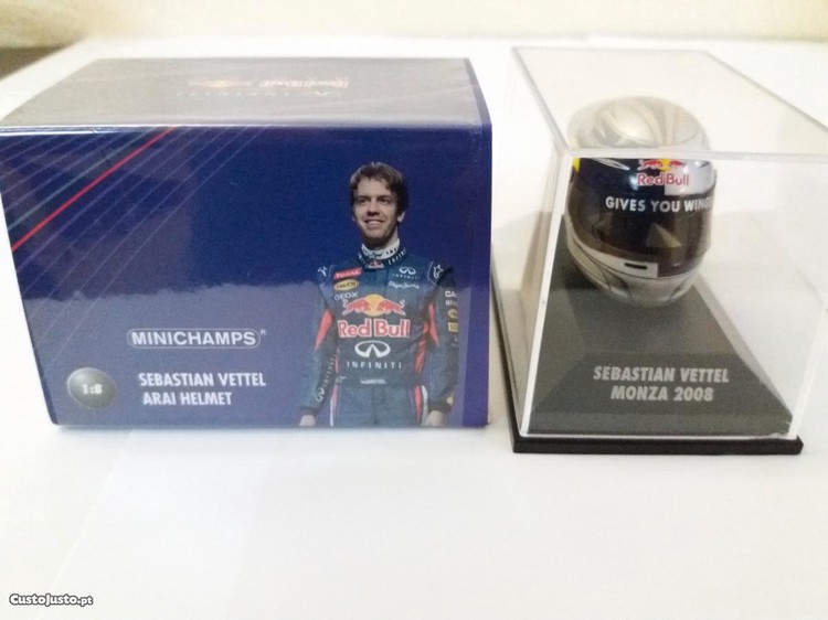 Miniaturas de Fórmula 1 da marca Minichamps, na escala 1:8, dos capacetes do piloto Sebastian Vettel, da primeira vitória da carreira em Monza 2008 (25 EUR) e dos anos de 2010 e 2012 em que foi campeão do mundo (30 EUR cada). Rigorosamente novos e com as embalagens originais. O de 2011 aparece nas fotos, mas já foi vendido.
