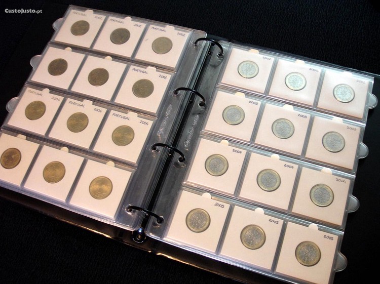 Moedas não-circuladas e conservadas dentro de alvéolos autocolantes.