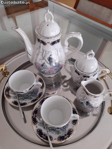Serviço de café em porcelana branca com motivos de pavões