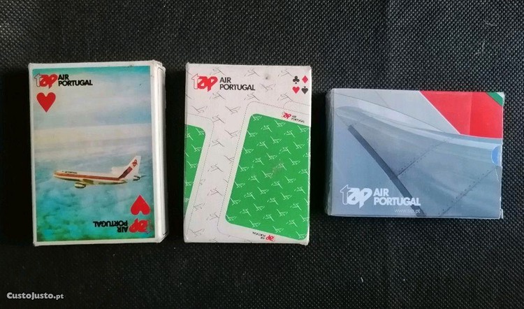 Preço: 16 €Set de 3 baralhos de cartas de jogar com a publicidade da Companhia Aérea Portuguesa TAP