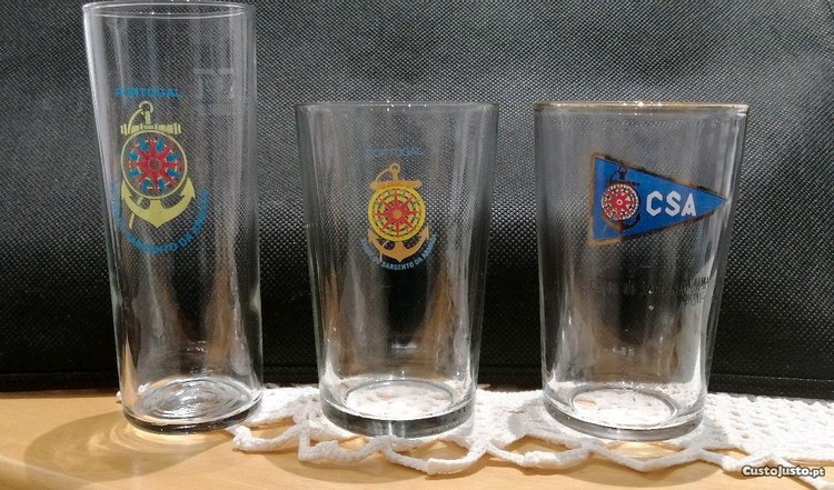 Preço: 25 €Set de 3 copos em vidro com o símbolo do Clube de Sargento da Armada da Marinha Portuguesa