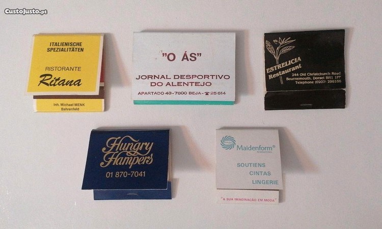 Preço: 12 €Set de 5 carteiras de fósforos com alguns anos, publicidade de restaurantes, jornais e roupa íntima
