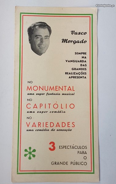 Programa do empresário Vasco Morgado para 3 espectáculos em cena no ano de 1966. No Capitólio, «A Mulher de Roupão, com Laura Alves. No Monumental, «Esta Lisboa que eu Amo, com Camilo de Oliveira, Maria Dulce, Simone de Oliveira, António Calvário, José Viana, Nicolau Breyner e a atracção Italiana Io Apoloni. No Variedades, «A Cidade não é para mim, com Ribeirinho.