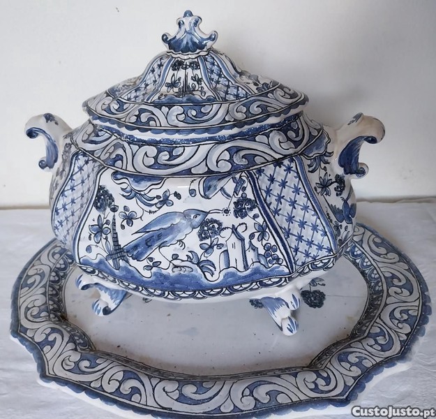 terrina com travessa da fábrica de faiança Berardos, pintadas à mão