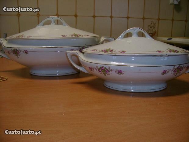 3 terrinas de sopa, duas do mesmo tamanho e outra mais pequena, muito antigas, de marca numerada