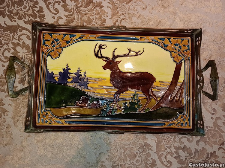 tabuleiro Tabuleiro séc XIX/XX retangular com alças em faiança. Guarnições em metal. Fundo esculpido à mão, prensado, esmaltado com caráter único. Tema delicado com alce detalhado em paisagem com enquadramento art noveau (1890 e 1910), caracterizado por linhas sinuosas, orgânicas e formas inspiradas na natureza, como flores e folhagens, valorizando o artesanato e a fusão entre arte e indústria.