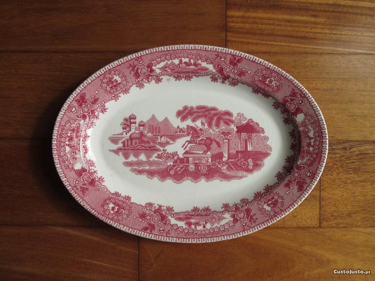 Vendo Travessa Pequena, Antiga, "Estátua - Gilman & CTA - Sacavém - Portugal", decoração Rosa, nova, isto é, sem uso, com as dimensões de 29 cm x 21 cm em Bom Estado mas com sinais de vidrado estalado.