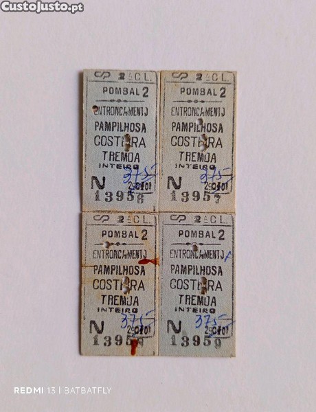 Preço: 9 €4 bilhetes comboio 2a CL da CP, Pombal 2 - Entroncamento - Pampilhosa - Costeira - Tremoa, inteiro